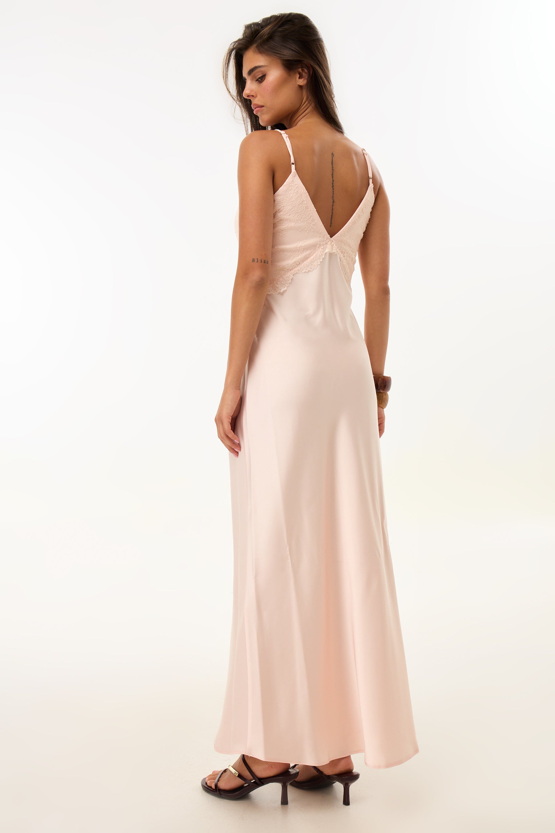 שמלה בגזרת מקסי עם מחשוף וי משולב תחרה בחזית. לשמלה כתפיות דקות מתכווננות ומחשוף וי בגב.